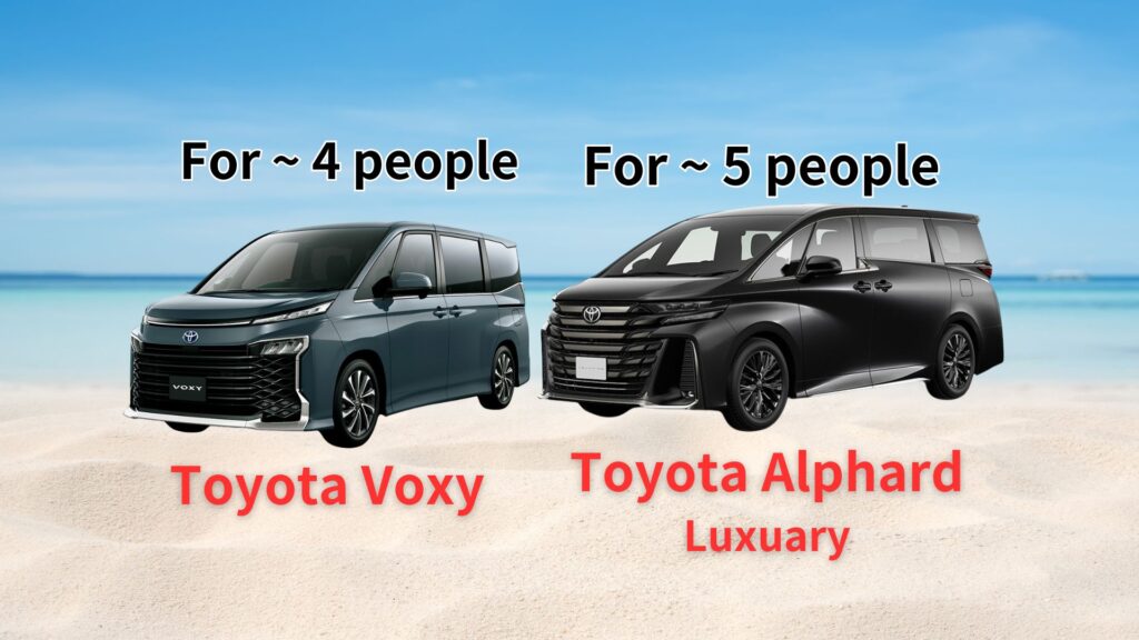 - For groups larger than two, a bigger vehicle can be rented (Toyota Voxy, Alfard, HiAce) Max 7 guests.